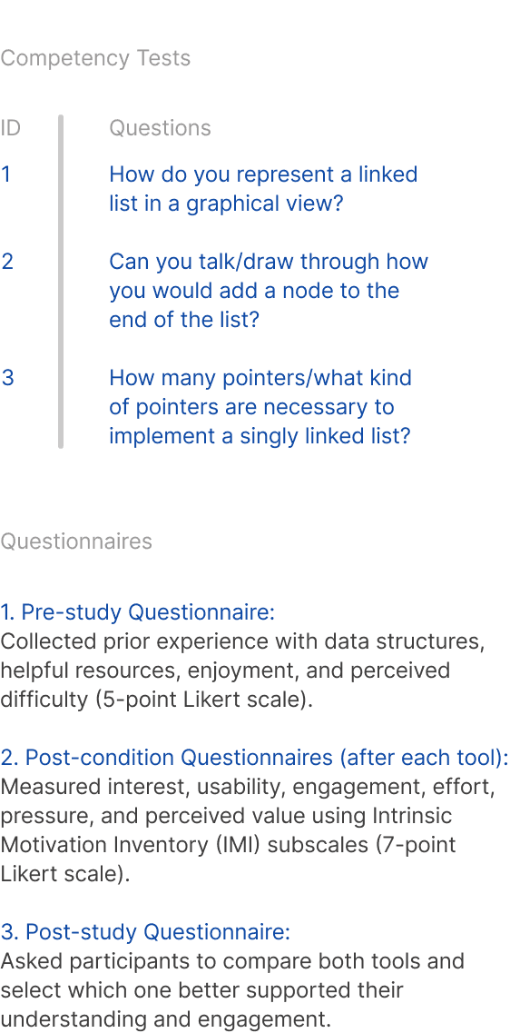 To prevent bias, the tool order and test questions were rotated. Each of the participants: