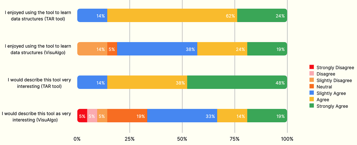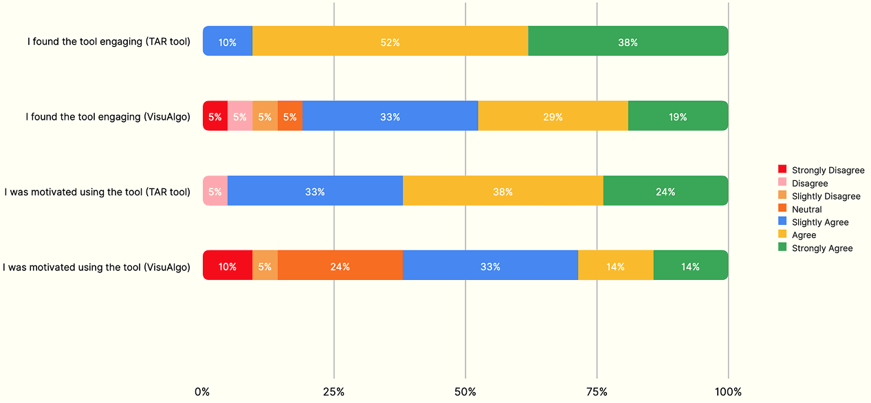 In contrast, 20% of participants (5% "Strongly Disagree," 5% "Disagree," 5% "Slightly Disagree," and 5% "Neutral") provided more negative or neutral responses towards the VisuAlgo tool. These results indicate that the tangible AR tool provides more favourable intrinsic engagement and motivation.