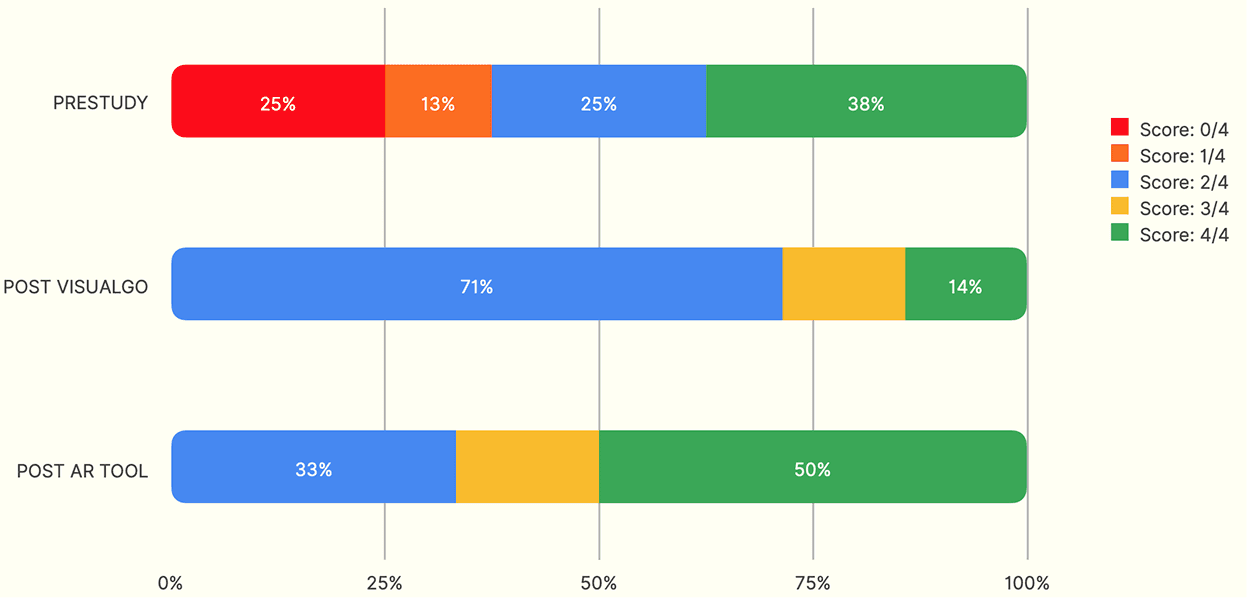 50% of participants completing this question after using the tangible AR tool got full marks compared to 14% of participants completing this question after using VisuAlgo.