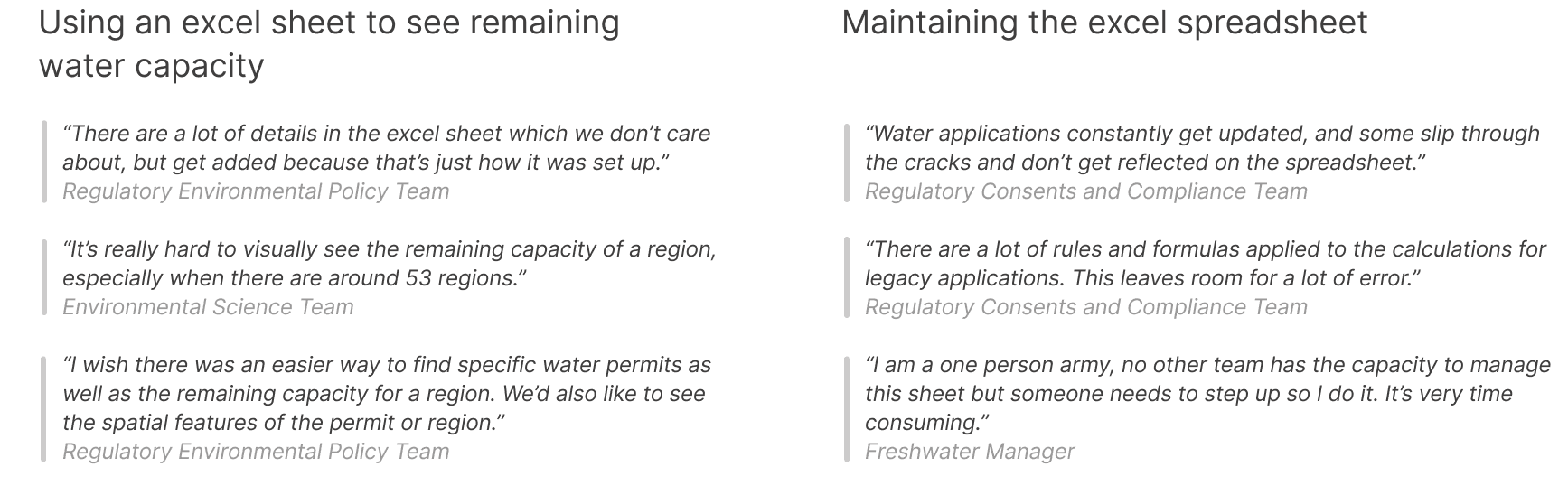 The local government currently tracks remaining water capacity for a region through a manual Excel spreadsheet. While applications are granted and recorded in a separate system, approvals are still checked against the spreadsheet to confirm available capacity.