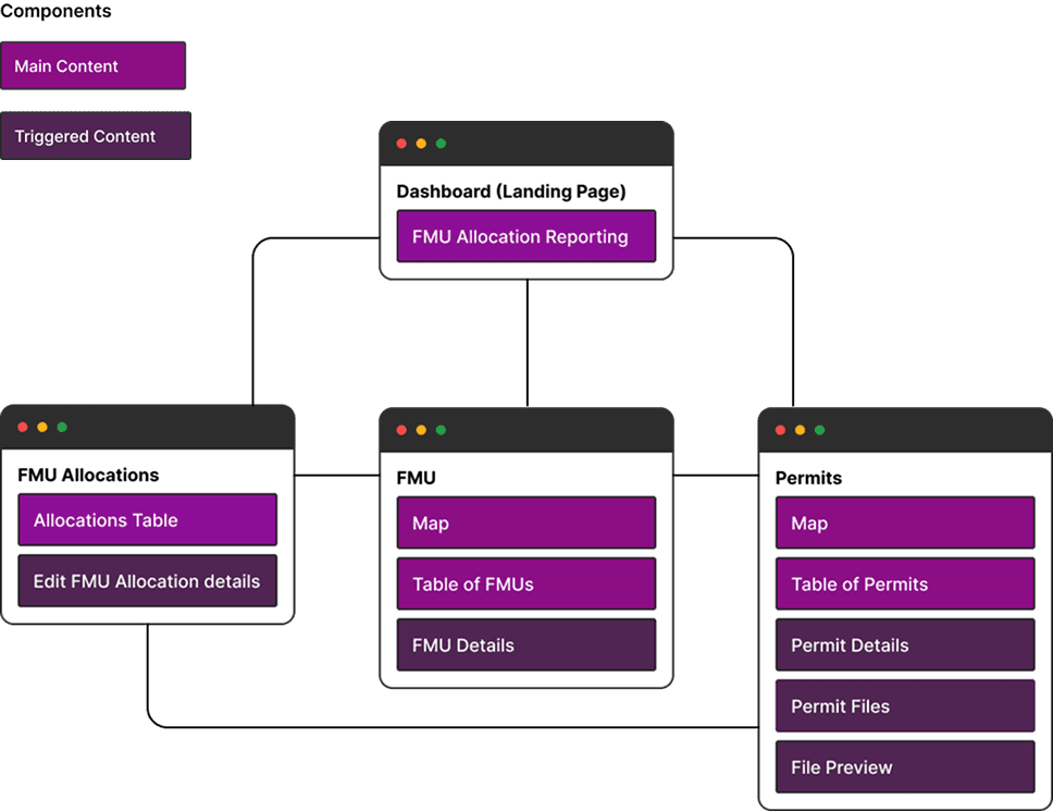 Consistent with the FMU page, the Permit page offers three ways to view a permit: by searching in the map’s search bar, selecting it directly on the map, or filtering and selecting from a table. When a permit is selected, key details that matter most to the client are displayed in the details section. There’s also a tab showing information about the FMU associated with that permit.