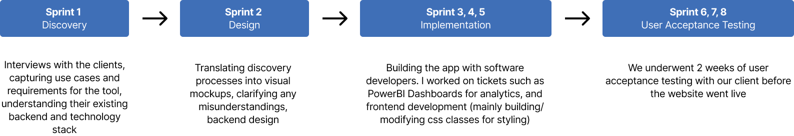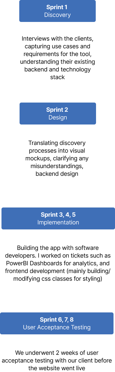 We adopted an Agile approach, organising work into sprints within Azure DevOps. I was involved in all of the sprints, but was leading the discovery and design process with our project manager.
