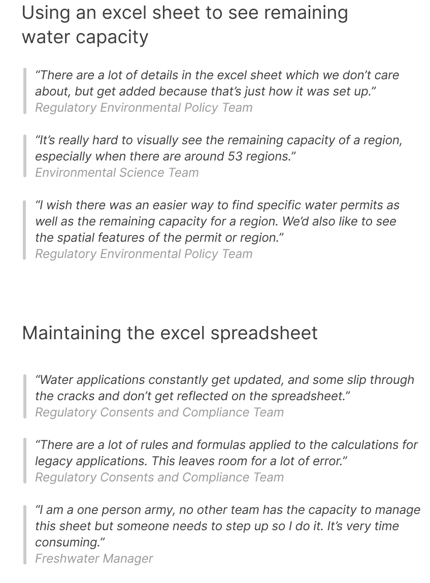 During our meeting with the clients, we focused on two pain points which was raised prior to the interviews. This is what they had to say about the current state of tracking water use in the city: