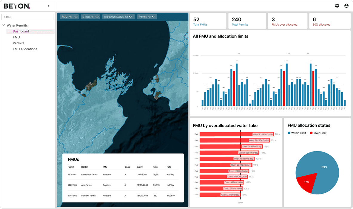 FMU page provides three ways to view a region’s allocation: by searching in the map’s search bar, by selecting the region directly on the map, or by filtering and selecting from a table. Key features include quick information cards at the top displaying the most important data, a red/blue visual gauge showing allocation levels, and a list of permits associated with the region.